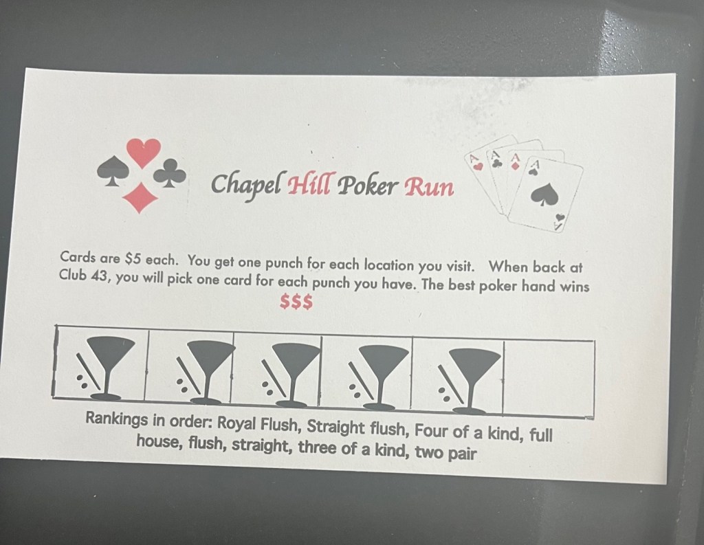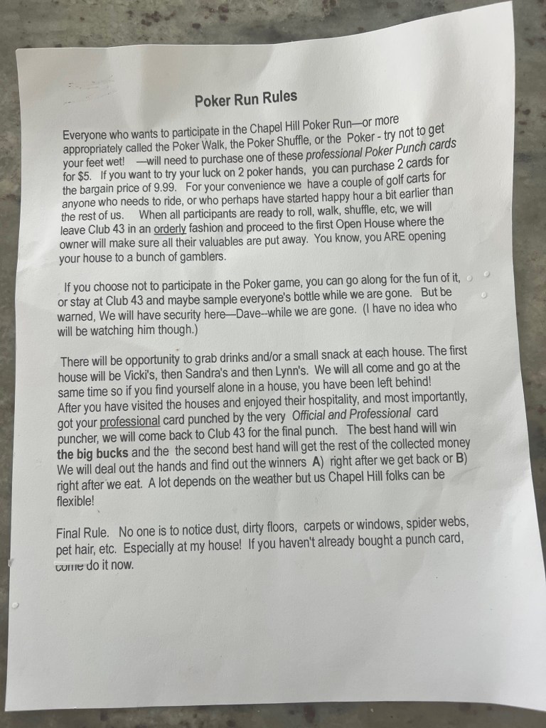 Chapel Hill Home Owners celebrated the Christmas holidays on December 16 with a Holiday House Hop & Poker Run. Beverly opened CLUB 43 to kick off the festivities. The gang then proceeded to house hop (between raindrops) and get their poker punches at three homes hosted by Vicki, Sandra and Lynn! Holiday cheer continued into the evening back at CLUB 43 with a catered Christmas dinner and Dirty Santa gift exchange. Once again the Social Committee led by Lynn knocked it out of the park for a fun and memorable evening.